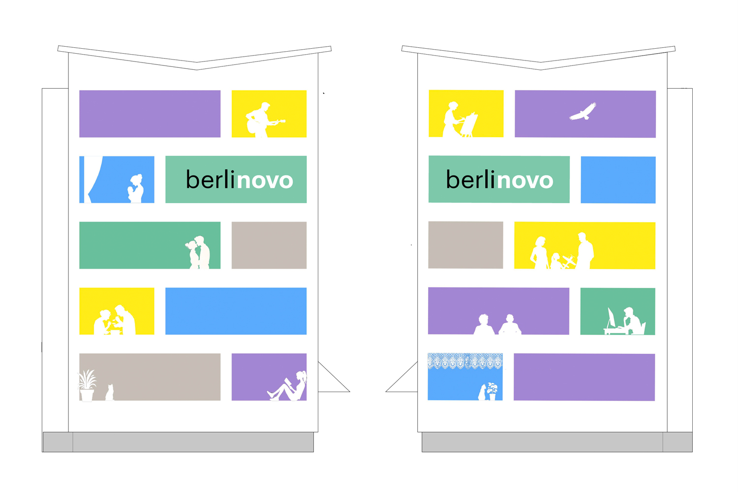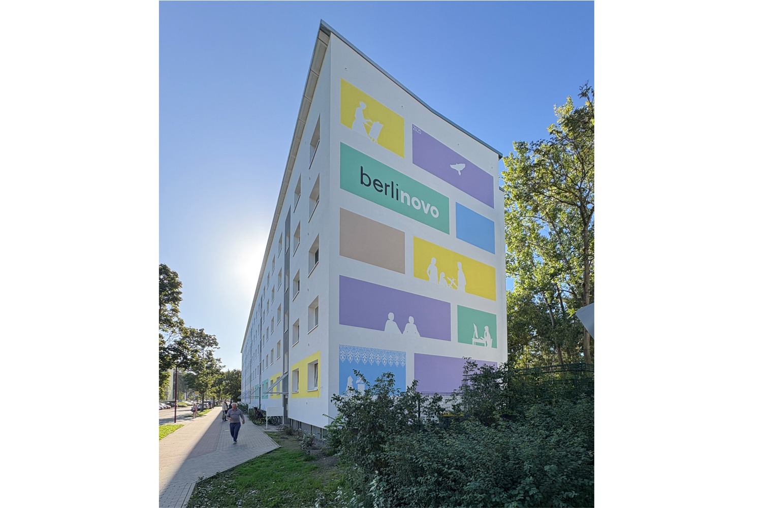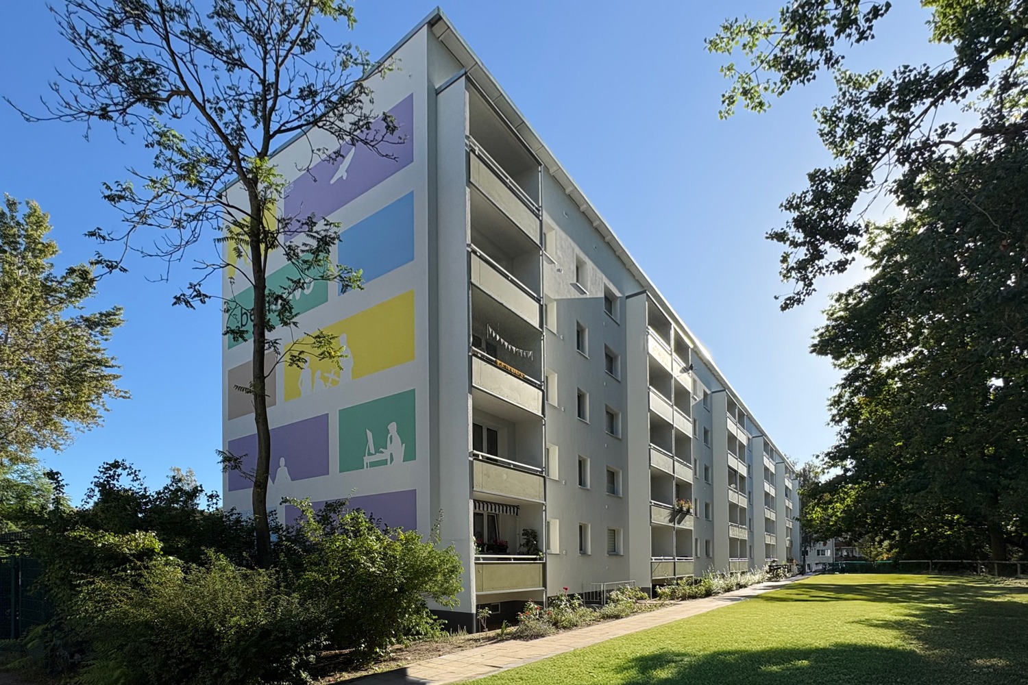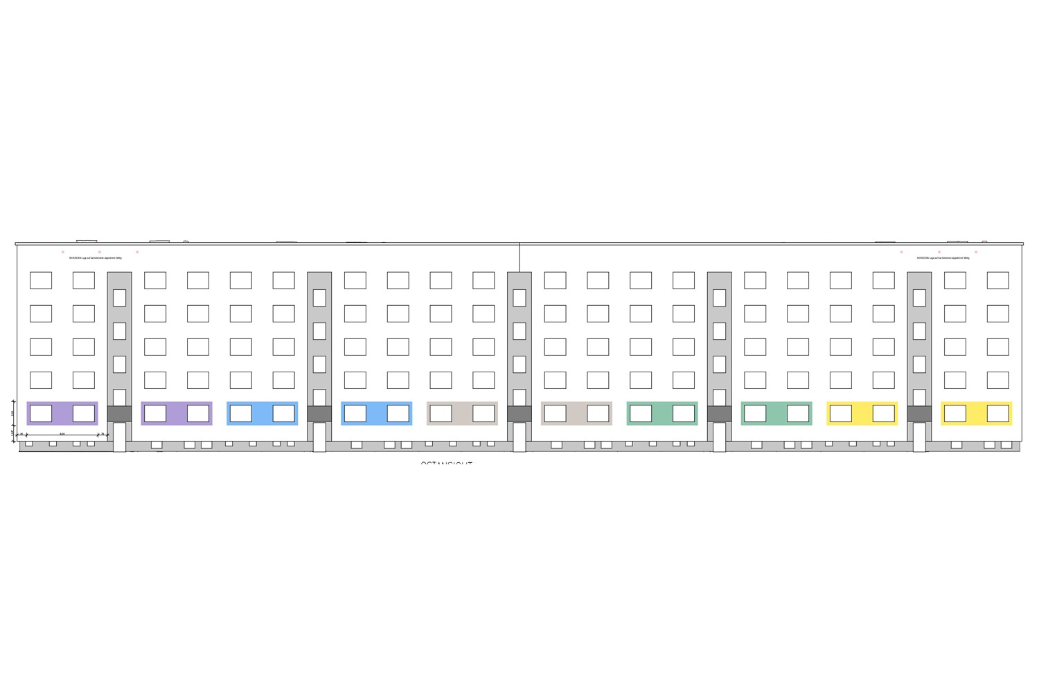 Im Rahmen der Fassadensanierung wurde ein neues Farbkonzept entwickelt. Die vorhandene Gebäudeform und -proportion wurde aufgenommen.
